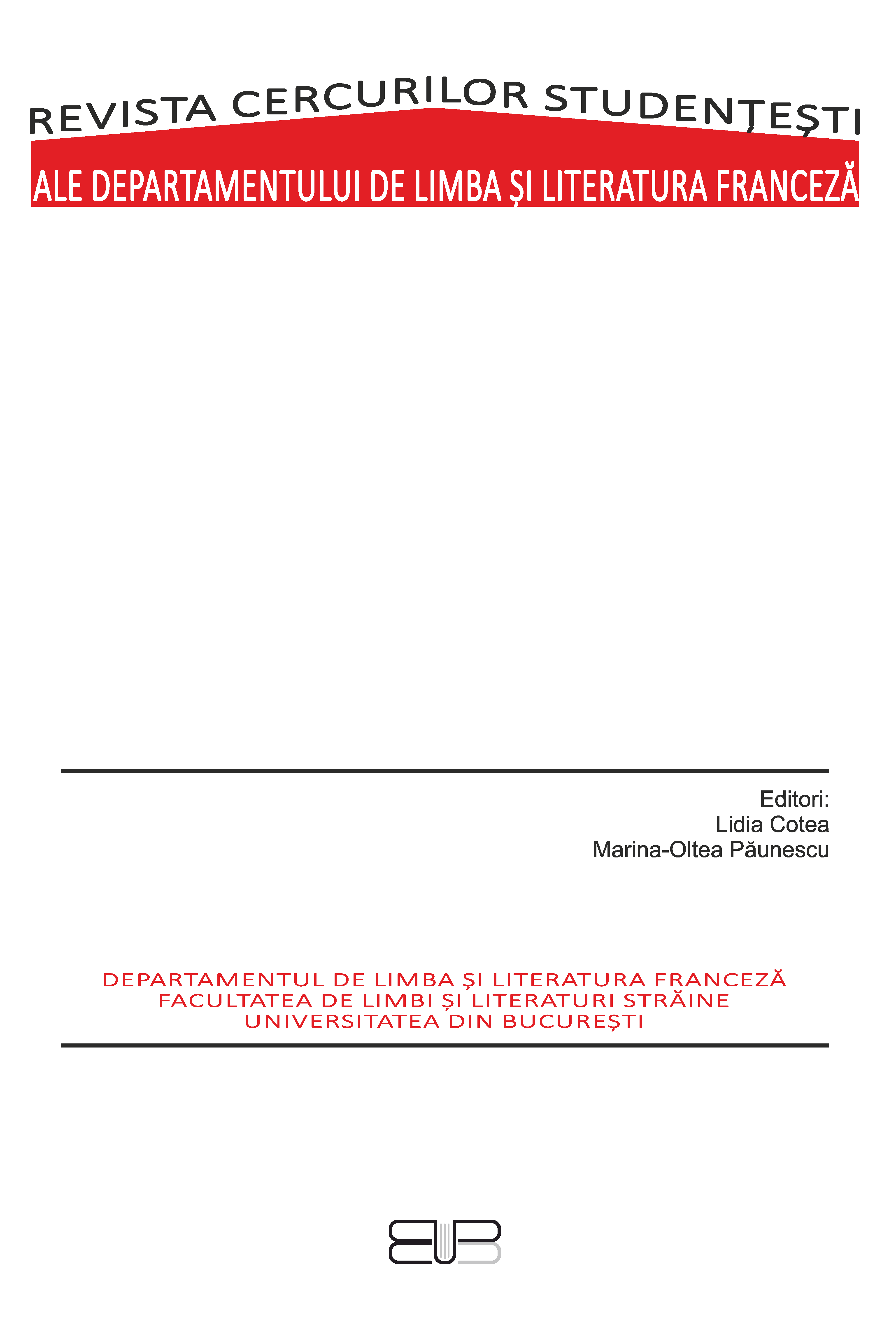 Vol. 13 No. 1 (2024)The journal gathers the best papers authored by members of the Department’s five student scientific research groups: French Literature, Culture and Civilization; French theoretical and applied linguistics; ContrasTER (Contrastive analysis, specialized translations and terminology), CENTRAL (literary translations), and The extreme contemporary literature: the Prix Goncourt. Selections by Romanian Students (a research group organized around the works of the Bucharest Jury that designates the Romanian laureate of the Prix Goncourt, an international cultural event the French Language and Literature Department is part of since 2013). Other contributions presented by our students in all kinds of national or international scientific events are also included. Each contribution is validated by an expert who officially endorses its coordination as well as by a prestigious international scientific committee.